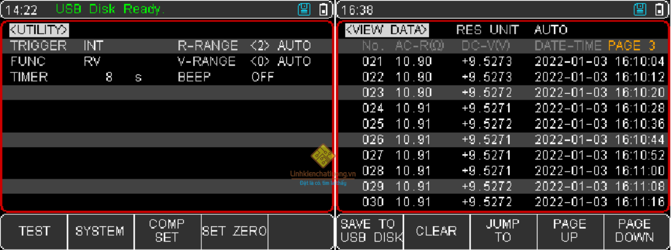 Đặt khoảng thời gian để tự động ghi lại dữ liệu đo. Có thể lưu trữ tối đa 500 bộ dữ liệu. Có thể xuất tài liệu định dạng CSV sang ổ USB để thuận tiện cho việc phân tích dữ liệu.