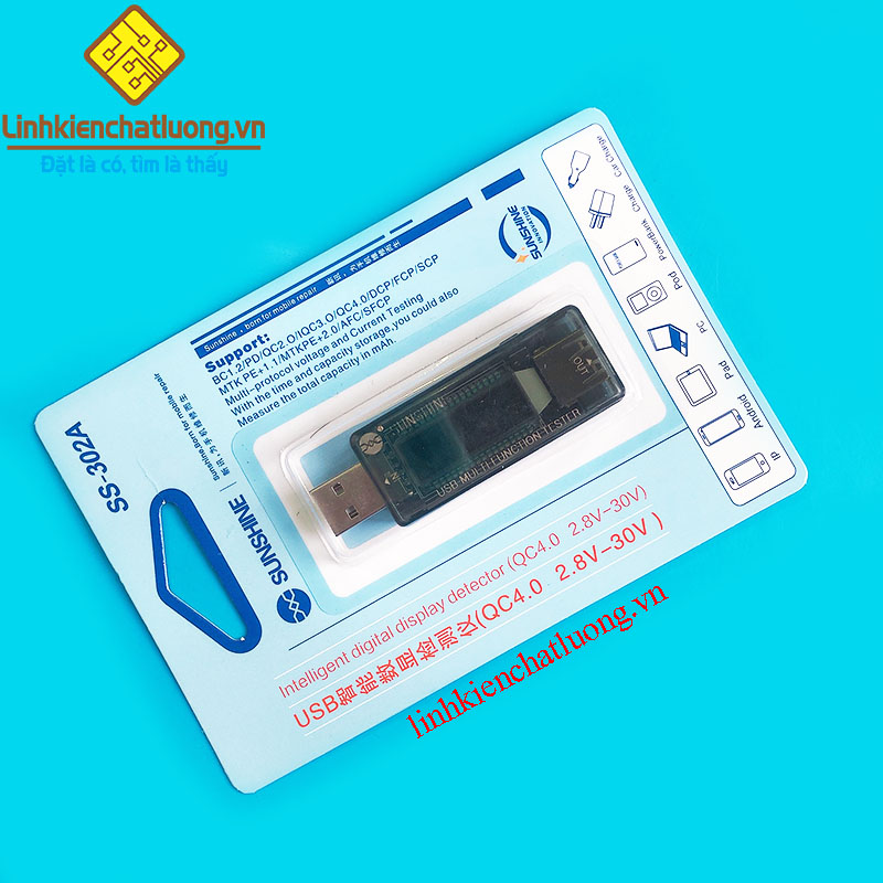 Giới thiệu về sản phẩm: SS-302A là thiết bị đo điện áp và dòng sạc USB thông minh của hãng Sunshine. Thiết bị này hỗ trợ công nghệ sạc nhanh QC4.0, cho phép kiểm tra chất lượng củ sạc, cáp sạc và pin dự phòng. Với màn hình kỹ thuật số, SS-302A giúp theo dõi và bảo vệ thiết bị điện tử của bạn bằng cách hiển thị dữ liệu sạc theo thời gian thực một cách chính xác.