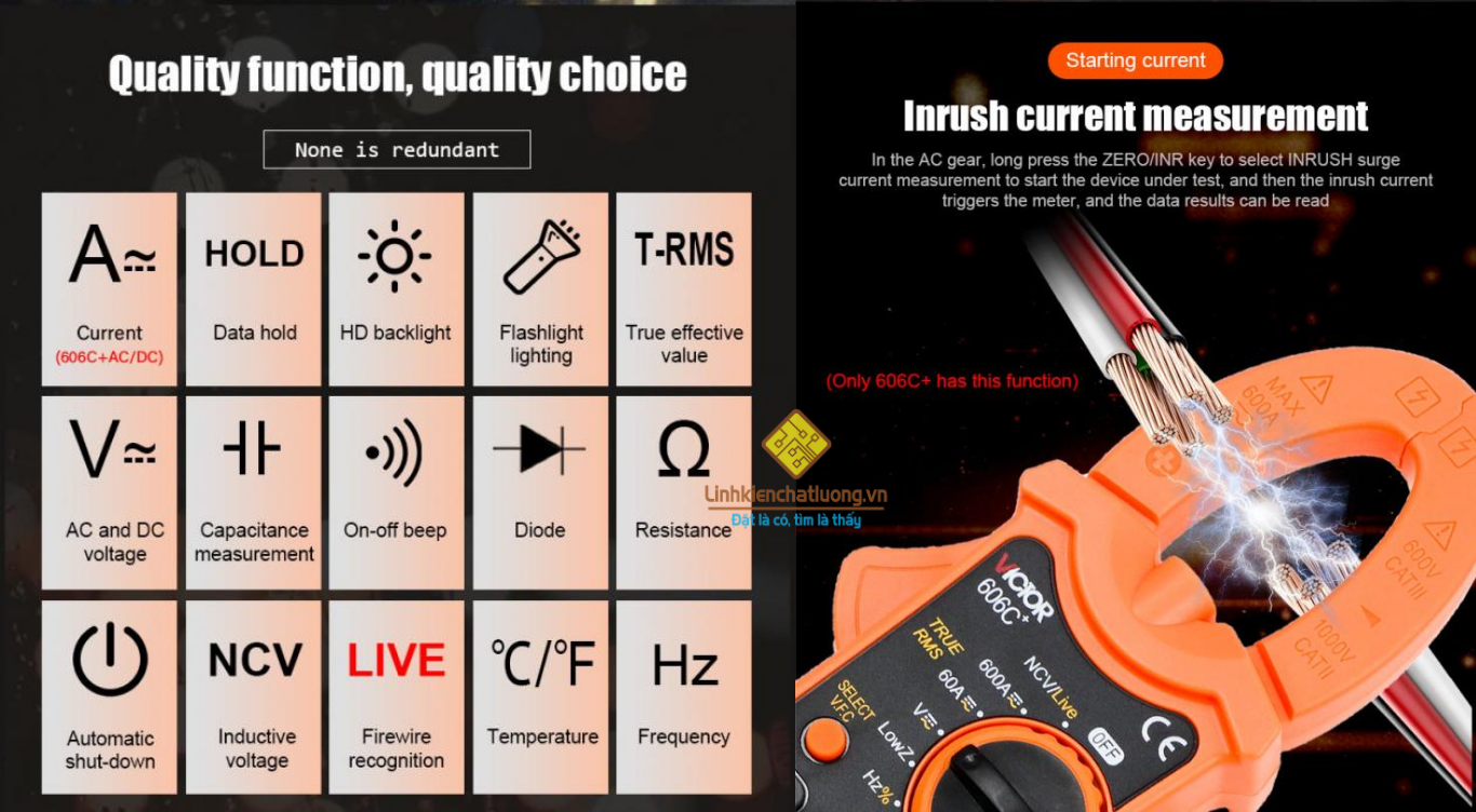 Giới thiệu về sản phẩm: VICTOR 606C+ là chiếc Ampe kìm kỹ thuật số True RMS mạnh mẽ, được thiết kế để đo dòng điện AC/DC lên đến 600A với độ chính xác và độ bềncao. Thiết bị này không chỉ đo dòng điện tải lớn mà còn tích hợp các chức năng của đồng hồ vạn năng (điện áp, điện trở, tần số, điện dung) và tính năng phát hiện điện áp không tiếp xúc (NCV). Với hiệu suất vượt trội và dải đo rộng 600A, VICTOR 606C+ là công cụ lý tưởng cho các kỹ thuật viên điện lạnh, điện công nghiệp và bảo trì hệ thống điện.