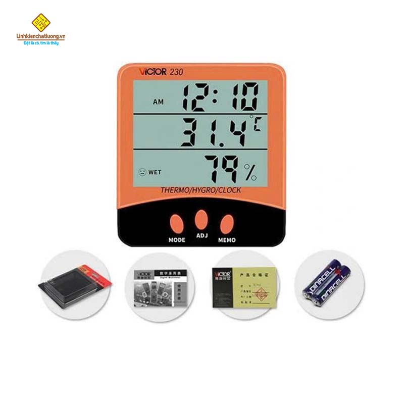 Giới thiệu về sản phẩm: VICTOR 230 là một nhiệt ẩm kế điện tử để bàn/treo tường đa năng, được thiết kế để theo dõi các chỉ số về môi trường trong nhà một cách tiện lợi. Sản phẩm có màn hình LCD lớn, hiển thị đồng thời Nhiệt độ (∘C/ ∘F), Độ ẩm (RH), và Thời gian, đồng thời có chức năng Lịch và Đồng hồ báo thức. VICTOR 230 còn có khả năng ghi nhớ và hiển thị giá trị nhiệt độ, độ ẩm cao nhất/thấp nhất, và có thể hiển thị trạng thái môi trường (COMFORT, WET, DRY) dựa trên mức độ ẩm. Với thiết kế nhỏ gọn, dễ đọc, đây là công cụ hữu ích cho các hộ gia đình, văn phòng hoặc nhà kho để theo dõi môi trường.
