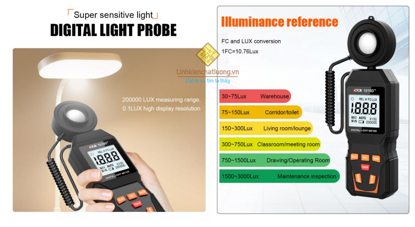 Giới thiệu về sản phẩm: VICTOR 1010D+ là máy đo cường độ ánh sáng kỹ thuật số chuyên nghiệp, được thiết kế để đo độ rọi và hiển thị cả nhiệt độ môi trường. Thiết bị có 5 dải đo tự động với phạm vi cực rộng lên đến 199.999 Lux (19.999 FC), đáp ứng nhiều nhu cầu sử dụng. Với đầu dò cảm biến quang điện silicon tách rời, 1010D+ cung cấp độ chính xác cao, cùng với các chức năng như giữ giá trị đo (Data Hold), đo giá trị Max/Min và tự động tắt nguồn, là công cụ lý tưởng cho các ứng dụng công nghiệp, nông nghiệp và văn phòng.