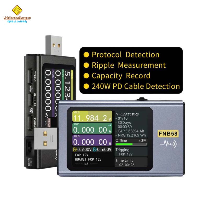 USB kiểm tra sạc nhanh đa năng FNIRSI FNB58 BT (4~28V, 7A, 140W, Bluetooth)