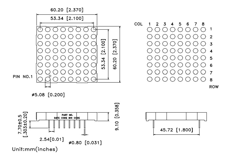 LED matrix 8x8 5mm màu đỏ 60x60mm A chung 2088BS
