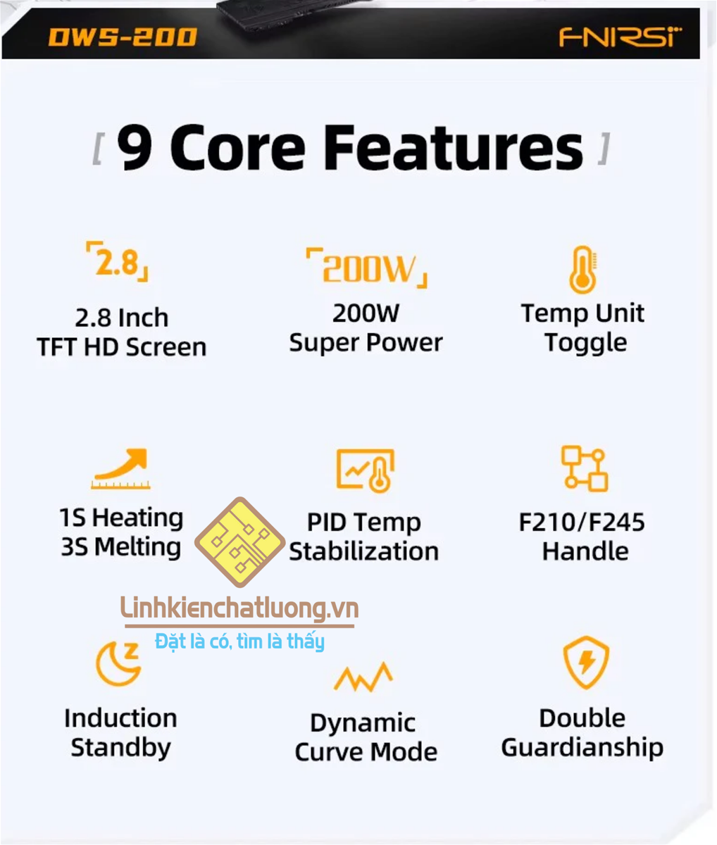 Giới thiệu về sản phẩm:  DWS-200 là trạm hàn chính xác công suất cao 200W do FNIRSI ra mắt. Đây là một dụng cụ cầm tay thường được sử dụng trong quy trình hàn điện tử. Sản phẩm này được tích hợp biến áp đồng nguyên chất công suất cao, phù hợp với điện áp đầu vào 100-240V, công suất tối đa 200W. Hỗ trợ chuyển đổi ℃ sang ℉, phạm vi nhiệt độ có thể điều chỉnh từ 100℃ đến 450℃ / 212℉ đến 842℉. Nó cũng hỗ trợ lựa chọn trước 3 bộ giá trị nhiệt độ và có thể được kết nối với giá đỡ mỏ hàn để ở chế độ chờ cảm ứng. Sử dụng chế độ đường cong nhiệt độ động để thử theo dõi dữ liệu.