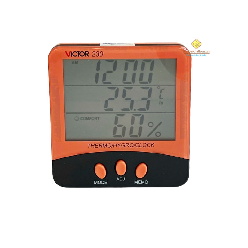 Giới thiệu về sản phẩm: VICTOR 230 là một nhiệt ẩm kế điện tử để bàn/treo tường đa năng, được thiết kế để theo dõi các chỉ số về môi trường trong nhà một cách tiện lợi. Sản phẩm có màn hình LCD lớn, hiển thị đồng thời Nhiệt độ (∘C/ ∘F), Độ ẩm (RH), và Thời gian, đồng thời có chức năng Lịch và Đồng hồ báo thức. VICTOR 230 còn có khả năng ghi nhớ và hiển thị giá trị nhiệt độ, độ ẩm cao nhất/thấp nhất, và có thể hiển thị trạng thái môi trường (COMFORT, WET, DRY) dựa trên mức độ ẩm. Với thiết kế nhỏ gọn, dễ đọc, đây là công cụ hữu ích cho các hộ gia đình, văn phòng hoặc nhà kho để theo dõi môi trường.