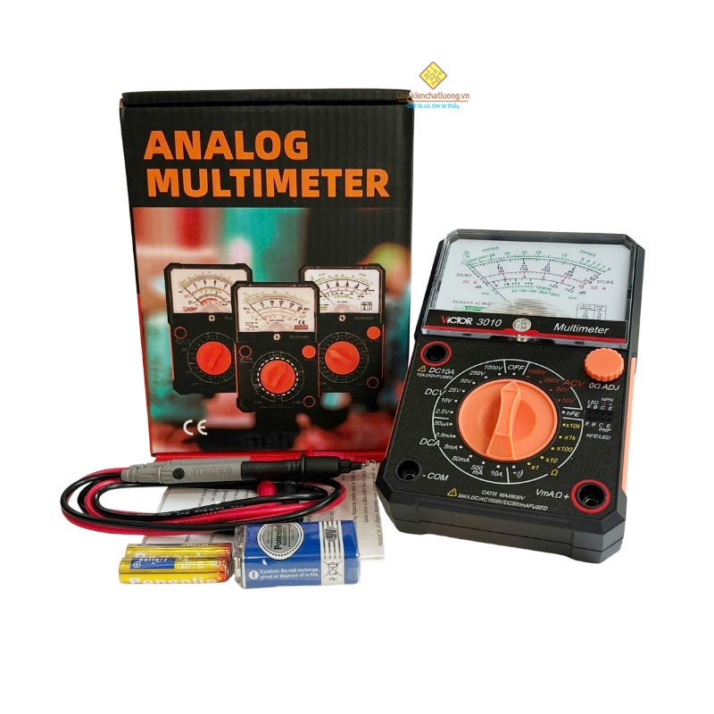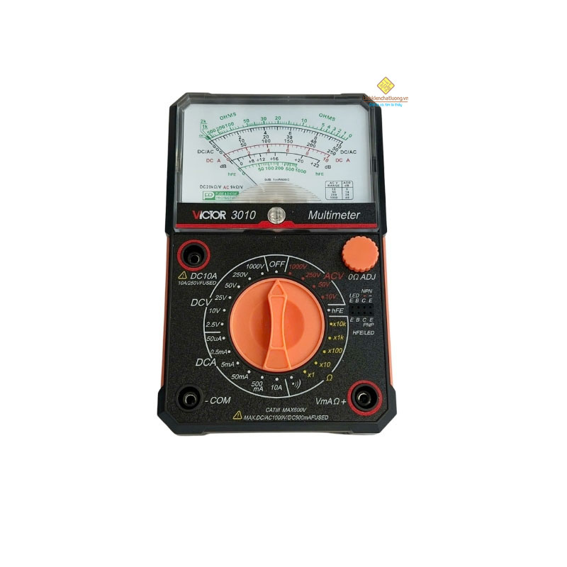Giới thiệu về sản phẩm: Victor VC3010 là một đồng hồ vạn năng kim nhỏ gọn, chuyên dụng để kiểm tra mạch điện tử và mạch có dòng điện nhỏ. Thiết bị đo Điện áp DC/AC (đến 1000V), Dòng điện DC (đến 10A) và Điện trở. VC3010 còn có các chức năng hữu ích như đo hệ số khuếch đại (hFE) Transistor và dBm, cùng với mạch bảo vệ chống quá tải, làm cho nó trở thành công cụ cơ bản và thiết yếu cho kỹ thuật viên điện tử.